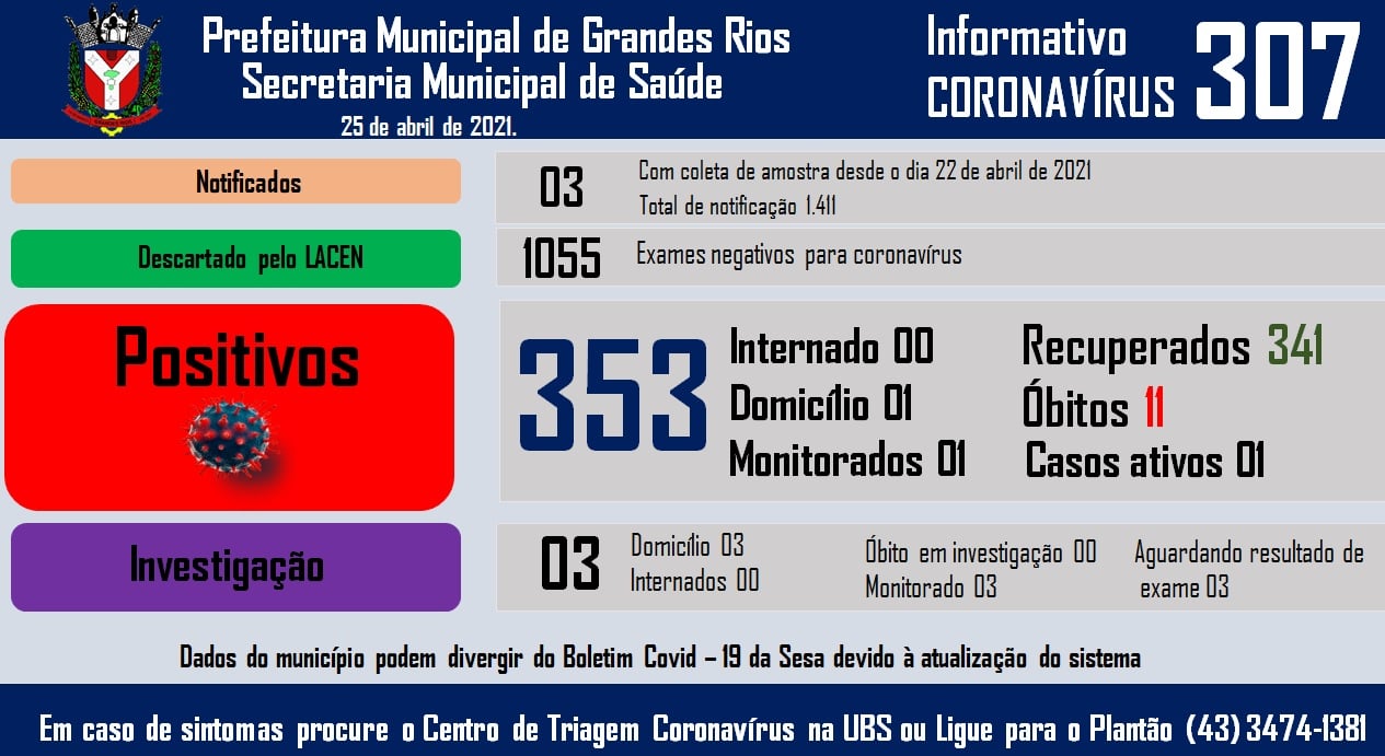 #PraCegoVer: Imagem exibe dados epidemiológicos diário do novo coronavírus do município de Grandes Rios - PR com o seguinte texto: Prefeitura Municipal de Grandes Rios. Secretaria Municipal de Saúde 19 de maio de 2021. Informativo Coronavírus 331. - Notificados 27; Com coleta de amostra desde o dia 18 de maio de 2021; Total de notificação 1.515. - Descartado pelo LACEN 1093 (Exames negativos para coronavírus). - Positivos 395; Reinfecção: 02 (Internados 01; Domicilio 19; Monitorados 19; Recuperados 363; Óbitos 12; Casos ativos 20). - Investigados 27 (Domicilio 27; Internados 00; Óbito em Investigação 00; Monitorados 27; Aguardando resultado de exame 27). Dados do município podem divergir do Boletim Covid – 19 da Sesa devido à atualização do sistema. Em caso de sintomas procure o Centro de Triagem Coronavírus na UBS ou Ligue para o Plantão (43) 3474-1381...